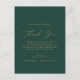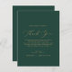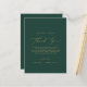 Este delicado cartão de obrigado verde e ouro que você recebe é perfeito para um casamento moderno. A design romântica minimalista apresenta uma magnífica e elegante tipografia amarela ouro champanhe num fundo verde esmeralda com um aspecto simples e limpo. Coloque essas placas na configuração de mesa para cada um dos seus convidados na sua recepção de casamento. Personalize o cartão com os seus nomes e uma mensagem de obrigado especial.