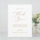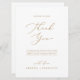 Este delicado obrigado de ouro de 6,5 x 8,75" é perfeito para um casamento moderno. A design romântica minimalista apresenta uma magnífica e elegante tipografia dourada num fundo branco com um aspecto simples e limpo. Coloque essas placas na configuração de mesa para cada um dos seus convidados na sua recepção de casamento. Personalize o cartão com os seus nomes e uma mensagem de obrigado especial.