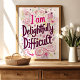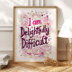 Adote a sua personalidade única com esta impressão de arte "Sou Deliciosamente Difícil". Apresentando uma letra manuscrita e delicados sotaques florais, esta peça celebra aqueles que se atrevem a ser diferentes. Perfeito por adicionar um toque de charme assombroso ao seu quarto, escritório ou onde você precisar de um lembrete da sua fabulosa complexidade.