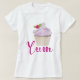 Uma t-shirt com tipografia que diz: Yum! Projetado com uma ilustração de um cupcake delicioso com espirais cor-de-rosa e uma baga com folhas aninhadas no glacé.