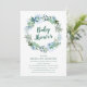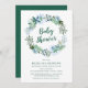 Elegantes convites para bebês florais apresentando uma coroa floral com flores azuis e verdes e folhagem complementada por uma bela fonte de escrita caligráfica. Personalize os convites de chic adicionando seus detalhes de chá de fraldas em lindas letras verdes da floresta.