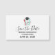 Imã salve a data de graduação com uma ilustração de um estilo de desenho animado grande dente branco sorrindo alegremente segurando uma escova de dente vermelha e dando aos polegares uma placa para cima. O dente está vestindo um boné de formatura preto.