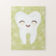 Este quebra-cabeça bonito caracteriza um dente feliz dos desenhos animados no fundo verde dos dentes, das estrelas e dos redemoinhos -- o clique PERSONALIZA para adicionar seu próprio logotipo do texto e/ou do negócio!