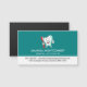 Cartões de visitas magnéticas com uma ilustração de um estilo de desenho animado, um grande dente branco sorrindo alegremente segurando uma escova de dentes vermelha e dando aos polegares uma placa para cima.