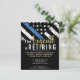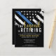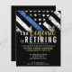 Este design apresenta uma bandeira da polícia com listras pretas e brancas, e uma fina faixa azul de linha também. O texto "A lenda está se aposentando" do ouro fica acima de todos os detalhes partidários para os detalhes do polícia aposentado, xerife, capitão ou chefe do partido aposentado.