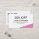 Excelente para promover a sua empresa, produtos e serviços. Estes cartões de descontos são uma compra incrível para recompensar seus clientes leais. Selecione um estoque de papel premium para qualidade adicionada. Para solicitações especiais, entre em contato com o designer. ©2010 Joshua Martin