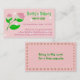 Cartão de visita lunático do divertimento feito em cor-de-rosa, em branco, e o verde. Uma flor do cupcake do divertimento no lado esquerdo, com um rosa com fundo branco das bolinhas. Um vale do estilo do entalhe está no verso. Aperfeiçoe para uma loja da padaria, a loja do partido, ou um padeiro feito sob encomenda independente. Personalize os campos do texto para personalizar para o senhor mesmo ou sua loja.