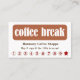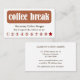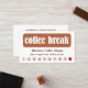 Mantenha seus clientes de café voltando com este cartão de fidelidade de desconto. A frente do cartão tem uma placa marrom com tipografia branca que declara "café quebrado". Há dois campos de texto para personalizar, além de um soco ou marca de série numérica no final inferior com uma estrela vermelha. A parte traseira da placa é branca, com mais campos de texto personalizados. Este cartão pode ser facilmente adaptado a um café ou a qualquer estabelecimento que venda bebidas de café.