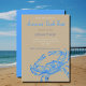 Um convite elegante ao estilo praia para um Banquete de Caranguejo de Verão. Ele apresenta uma ilustração antiga de um caranguejo azul com os detalhes da sua festa em diferentes tons de azul e cinza. A manchete vem no estilo caligrafia. Cartão estilo costeiro com khaki (#C3B091) azul sólido frontal inverso. Design por Alma Wad.