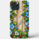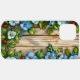 Traga a energia fresca da primavera para o seu telefone com este Design de Flores Azuis e Joaninhas em Madeira Rústica da Natureza, folhas verdes vibrantes e joaninhas divertidas dispostas sobre um fundo de madeira rústica.