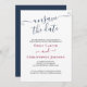 Simples e Elegante Guardar a Data, Atualização de Casamento para notificar os convidados do adiamento do casamento. O design está em marinho azul, burgundy e branco com elegantes letras de mão e fontes de serifa clássicas. O texto da amostra diz "Lamentamos anunciar que, devido a acontecimentos recentes, o casamento de [seus nomes] foi adiado. Iremos informá-lo assim que estabelecermos uma nova data. Foi uma decisão difícil e nós o obrigados pela sua compreensão". O modelo está configurado para que você adicione seus nomes e edite o máximo de contas de adiamento que desejar.