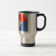 A Caneca de viagem tem um design abstrato nas cores de creme, vermelho, azul e design digital bronzeado com raios. Você pode mudar as palavras na caneca.