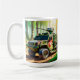 A imagem mostra um veículo militar robusto e camuflado estacionado em um cenário brilhante e suave de selva. O corpo do veículo é pintado em padrões de camuflagem verdes, castanhos e bronzeados, projetados para se misturar com seus arredores. Os pneus grandes e robustos são construídos para fazer face a um terreno acidentado e irregular, e a sua estrutura é reforçada com placas blindadas. Uma torre de armas montada é posicionada sobre o topo, pronta para combate, e uma corda de cobrir sobre o compartimento traseiro, fornecendo ocultação adicional. A frente do veículo apresenta uma estrela vermelha e em negrito, acrescentando um toque distinto ao seu design. A luz solar filtra através da cobertura acima, lançando um brilho quente e apavorado em toda a cena, destacando os detalhes robustos do veículo enquanto a densa folhagem verde o circunda, enfatizando o preparo do carro militar para a batalha em um desafiador ambiente da selva.