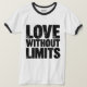 Um design de camiseta com fundo branco dizendo "Amor sem Limites" no estilo de fonte ousada e vintage Georgia com bordas angustiadas.