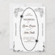 Este cartão de convite de casamento apresenta um clássico design preto e branco com elegantes bordas florais em cada canto. A área central é destacada por uma borda de forma na moda oval, adicionando um toque de sofisticação ao design geral. Este convite é perfeito para um tema de casamento tradicional e eterno.