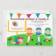 Comece a comemorar com este adorável convite de futebol. Há um posto de campo com uma bola de futebol voando nele. Há quatro jogadores de futebol vestidos de azul, vermelho, verde. e uniforme cor de laranja parado na grama. Há uma faixa colorida pendurada no topo deste convite.Veja os muitos outros produtos e designs nesta linha. © Ilustrações JW