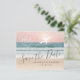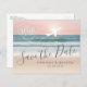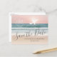 Destino da praia BUDGET, salve o cartão postal com um avião cardíaco sobre um pôr do sol cor-de-rosa pincelado numa praia de areia com ondas oceânicas e design moderno.