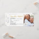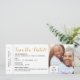Cartão de embarque divertido e elegante guarde a data de um casamento de destino com espaço para adicionar sua foto e muito espaço para detalhes práticos de planejamento de viagem para seus convidados. Um ícone romântico de avião e os detalhes autênticos da passagem de avião retrorreflector, incluindo pequenas setas, um código de bar e uma caixa para uma atribuição de assentos em uma fonte de computador vintage, completem a aparência. Casamentos de destino exigem um pouco mais de planejamento para contar aos convidados todas as informações sobre acomodação antes de um casamento local, então inclua tudo o que puder. Se você quiser simplesmente divulgar a palavra enquanto você elabora os planos de viagem e excursão, o design no verso pode ser totalmente excluído, basta clicar em 'personalizar mais'.