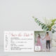 Bilhete de Plano de Passagem de Embarque Salve o Anúncio de Convite de Data para um Casamento de Destino no Exterior que tenha um modelo editável com espaço para uma foto e detalhes autênticos de retrô, como um código de bar e uma fonte de impressora de computador com sotaques cor-de-rosa com pincel de rosa e ícone romântico de avião. Destinos de Uvas de Papel no Zazzle são especializados em convites para temas de viagem e artigos de papelaria para o casal aventureiro e de luxo que planeja suas núpcias no exterior. ©Paper Grape