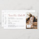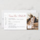 Logotipo de avião cor-de-rosa dourado num cartão de embarque de diversão, guarde o cartão para um tema de viagem ou casamento de destino, com espaço para uma fotografia e muito espaço para viagem e detalhes de alojamento. Os detalhes autênticos do tíquete retrorreflector incluem pequenas setas, código de bar e caixa para uma atribuição de assentos em uma fonte de computador vintage completa a aparência. Os casamentos de destino exigem enviar aos convidados todas as informações de alojamento antes de um casamento local. Se você quiser simplesmente divulgar a palavra enquanto você elabora os planos de viagem e excursão, o design no verso pode ser excluído, basta clicar em 'personalizar mais'. Destinos de Uvas de Papel no Zazzle são especializados em convites para temas de viagem e artigos de papelaria para o casal aventureiro e de luxo que planeja suas núpcias no exterior.