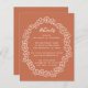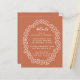 Um cartão de detalhes do casamento orçamentário com o texto contido em um quadro floral aproximadamente oval, uma coroa floral. Os detalhes do título são escritos em script, o restante em bonés. O texto e o quadro floral são brancos, o fundo é terracota. A floricultura é do antigo cobrir do livro de 1895 Carrots da Sra. Molesworth, agora no dominio público.