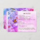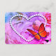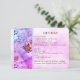 Cartão de detalhes com o recebimento e acomodações para o convidado. Belo design com uma borboleta laranja tocando contas de pérola em forma de coração branco. Outra borboleta se mistura ao buquê de rosas rosa, roxo e azul. Imagem de papel pergaminho. Converta isso para qualquer ocasião. Adicione uma foto e/ou altere o texto.