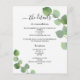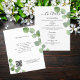 Um moderno e elegante programa/detalhes/cronograma de casamento. Um fundo branco decorado com folhagens de eucalipto. Personalize e adicione seus nomes e detalhes do casamento. Letras pretas.