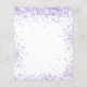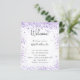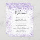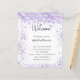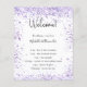 Um programa de casamento moderno e elegante, linha do tempo. Um fundo branco decorado com poeira brilhante violeta, de cor lavanda. Personalize e adicione seus nomes e detalhes do casamento. Letras pretas coloridas. Se você tiver mais texto, é possível reduzir o espaço na linha.