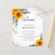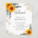 Um programa de casamento moderno, elegante, cronograma. Um fundo branco chic. Decorados com girassóis, folhas verdes de eucalipto de cor aquosa, prigos, verde, folhas de ouro falsas e manchas ouros. Personalize e adicione seus nomes e detalhes do casamento. Letras pretas coloridas. Se você tiver mais texto, é possível reduzir o espaço na linha.