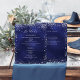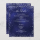 Um programa de casamento moderno e elegante/detalhes/cronologia. Um fundo marinho de cor azul decorado com faxes cintilantes prateados. A cor azul é irregular. Personalize e adicione seus nomes e detalhes do casamento. Letras brancas coloridas. Texto de ambos os lados. 1 folha = 1 programa impresso borda a borda.