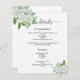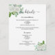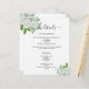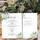 Um moderno e elegante programa/programa/cronograma de casamento. Um fundo branco, decorado com flores brancas de cor aquosa e verde de eucalipto. Personalize e adicione seus nomes e detalhes do casamento. Letras pretas coloridas. Texto de ambos os lados. 1 folha = 1 programa impresso borda a borda.