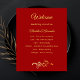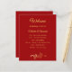 Um fundo de cor vermelha decorado com ouros florais, espirais. Personalize e adicione seus nomes e detalhes do casamento. Letras coloridas com ouro. Se você tiver mais texto, é possível reduzir o espaço da linha e adicionar texto no verso.
