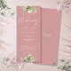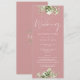 Um convite de casamento floral verde com tipografia de caligrafia elegante em um fundo rosa poeirento. Criado por Thisisnotme