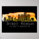 A Impressão de arte apresenta a silhueta do horizonte da cidade de Detroit Michigan com a cor da água do pôr do sol e as coordenadas do mapa de latitude e longitude, em fundo preto