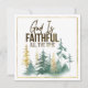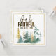 Um cartão de saudação de aspas planas de aspas inspiracionais retrata um simples design de aquarela natural, incluindo uma floresta de pinheiros verdes e dourados. Ele apresenta uma citação encorajadora e cristã, "Deus é Fiel o tempo todo."