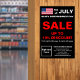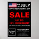 Feliz Dia da Independência! Feriado para celebrar e sentir liberdade. É também um dos feriados do ano para anunciar sua empresa. Poster personalizável com vendas no dia da independência, seu nome comercial e outras informações. Poster que você pode usar como material de marketing para atrair mais clientes. Personalize-o e use-o para convencer mais clientes a comprar de seus produtos ou clientes para que gostem de seus serviços neste dia de independência. As cores e formas design são textos vermelhos e brancos sobre fundo preto e forma retangular de formato de retrato. O conteúdo é a bandeira, 4 de julho, Dia da Independência Feliz, venda, desconto percentual que você oferecerá, datas de venda, seu nome comercial, logotipo, endereço, número de telefone, e-mail e site ou sua página de mídia social. Verifique a aparência após carregar o logotipo e digitar textos. Se a aparência lhe agrada, você pode colocar seu pedido agora. Se você precisar redimensionar e mover o logotipo e os textos para o ajustado neste poster ou em outro tamanho, forma e estilo apropriados que você escolherá, mude na ferramenta design. Você também pode fazer outras alterações na ferramenta design de acordo com a aparência deste poster, que você prefere, como alterar a cor do fundo, a cor da fonte e o estilo da fonte. Feliz Dia da Independência! Sinta a liberdade! Desejando mais vendas neste feriado.