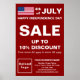 Feliz Dia da Independência! Feriado para celebrar e sentir liberdade. É também um dos feriados do ano para anunciar sua empresa. Poster personalizável com vendas no dia da independência, seu nome comercial e outras informações. Poster que você pode usar como material de marketing para atrair mais clientes. Personalize-o e use-o para convencer mais clientes a comprar de seus produtos ou clientes para que gostem de seus serviços neste dia de independência. As cores e formas design são textos brancos sobre fundo vermelho e forma retangular de formato de retrato. O conteúdo é a bandeira, 4 de julho, Dia da Independência Feliz, venda, desconto percentual que você oferecerá, datas de venda, seu nome comercial, logotipo, endereço, número de telefone, e-mail e site ou sua página de mídia social. Verifique a aparência após carregar o logotipo e digitar textos. Se a aparência lhe agrada, você pode colocar seu pedido agora. Se você precisar redimensionar e mover o logotipo e os textos para o ajustado neste poster ou em outro tamanho, forma e estilo apropriados que você escolherá, mude na ferramenta design. Você também pode fazer outras alterações na ferramenta design de acordo com a aparência deste poster, que você prefere, como alterar a cor do fundo, a cor da fonte e o estilo da fonte. Feliz Dia da Independência! Sinta a liberdade! Desejando mais vendas neste feriado.