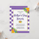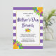 Este design colorido, branco, mas elegante apresenta um buquê impressionante de flores brilhantes e bonitas em tons negros de laranja, amarelo, azul, rosa e roxo contra um fundo de alto contraste de listras roxas e brancas.O local personalizável, RSVP e detalhes de contato aparecem dentro uma área branca dourada no centro em tipografia popular, com as palavras "Brunch Dia de as mães" aparecendo na escuridão roxo.