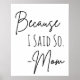 Dia de as mães Presente Porque Eu Disse Tão Poster. Presente perfeito para qualquer ocasião especial.