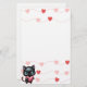 Adorável gato preto segurando um coração para o Dia de os namorados. Linhas com corações cor-de-rosa e vermelho no topo e no fundo da página.