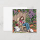 Uma bela ilustração do ai feita em um estilo de desenho animado de uma senhora bebendo café no seu pátio fora com seus dois gatos brancos. Ela está rodeada por belas cercas de Clematis roxa e outras plantas bonito.
