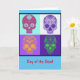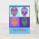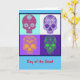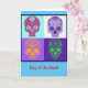 Dia do cartão do festival mexicano morto, quatro crânios florais de açúcar/doces em cores brilhantes e engraçadas. Celebre a família e os amigos que passaram. Este cartão é vazio de dentro para sua própria mensagem.