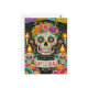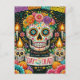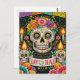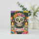 Convide seus convidados para uma comemoração vibrante do Dia dos Mortos com este cartão postal colorido com crânios tradicionais de açúcar, flores brilhantes e decorações festivas. Perfeito para dar o tom a uma festa memorável!