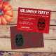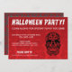 Convite para festas de Halloween com o Dia da design do crânio morto em vermelho e preto com tipo branco. Crânios vermelhos profundos, um preto, sobre uma cinza na parte de trás do convite. Personalize o seu texto para criar o seu próprio convite de tendências para espalhar a palavra sobre a sua maldita cesta de halloween!