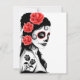 Este Dia dos Mortos inspirou uma design com uma bela mulher com padrões de crânio de açúcar no rosto. Três rosas vermelhas aparecem em seu cabelo preto a jato com mais dois rosas tatuados em seu braço. A garota está de lado com a cabeça virada levemente para o espectador. Sua pele branca pura realmente se destaca contra o cabelo preto e se mistura perfeitamente no fundo claro. Esta design única é uma representação impressionante deste Dia da Mulher Morta.