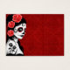 Este Dia dos Mortos inspirou uma design com uma bela mulher com padrões de crânio de açúcar no rosto. Três rosas aparecem em seu cabelo preto a jato com mais dois rosas tatuados em seu braço. A garota está de lado com a cabeça virada levemente para o espectador. Sua pele branca pura realmente se destaca contra o cabelo preto e o vestido assim como o fundo vermelho ligeiramente texturizado. Esta design única é uma representação impressionante deste Dia da Mulher Morta.