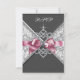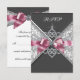 Convite de festa de 16 anos elegante com diamantes brancos laço rosa sobre damasco preto. Este lindo convite de RSVP com damasco rosa é facilmente personalizado para o seu evento, bastando clicar no botão "Personalize!" para começar a adicionar os detalhes do seu evento, estilo de fonte, tamanho e cor da fonte e texto. Por favor, note que todos os cartões e convites que você encontrará na Zazzle são gráficos impressos sem joias, laços, relevos, rebaixos ou peças adicionais.