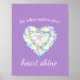 Pintura em diamante colorido d'água sobre fundo roxo com as palavras Faça o que faz você brilhar poster. Um impressão de uma pintura original de cor d'água do coração de diamante. A cor de fundo pode ser alterada para se adequar ao seu quarto, se necessário, atualmente roxo. © Impressão a aquarela original e design por Sarah Trett www.sarahtrett.com para www.mylittleeden.com