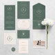 Um design de monograma em forma de losango floral verde em um cartão de menu de casamento que é criado a coordenar com a coleção Diamond por Impressões Origami.