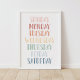 Apresente o seu filho aos dias da semana com este poster de aquarela com letra manual. Decorra uma parede no berçário, no quarto ou na sala de jogos da sua criança com este impressão educacional para encorajar a aprendizagem todos os dias.